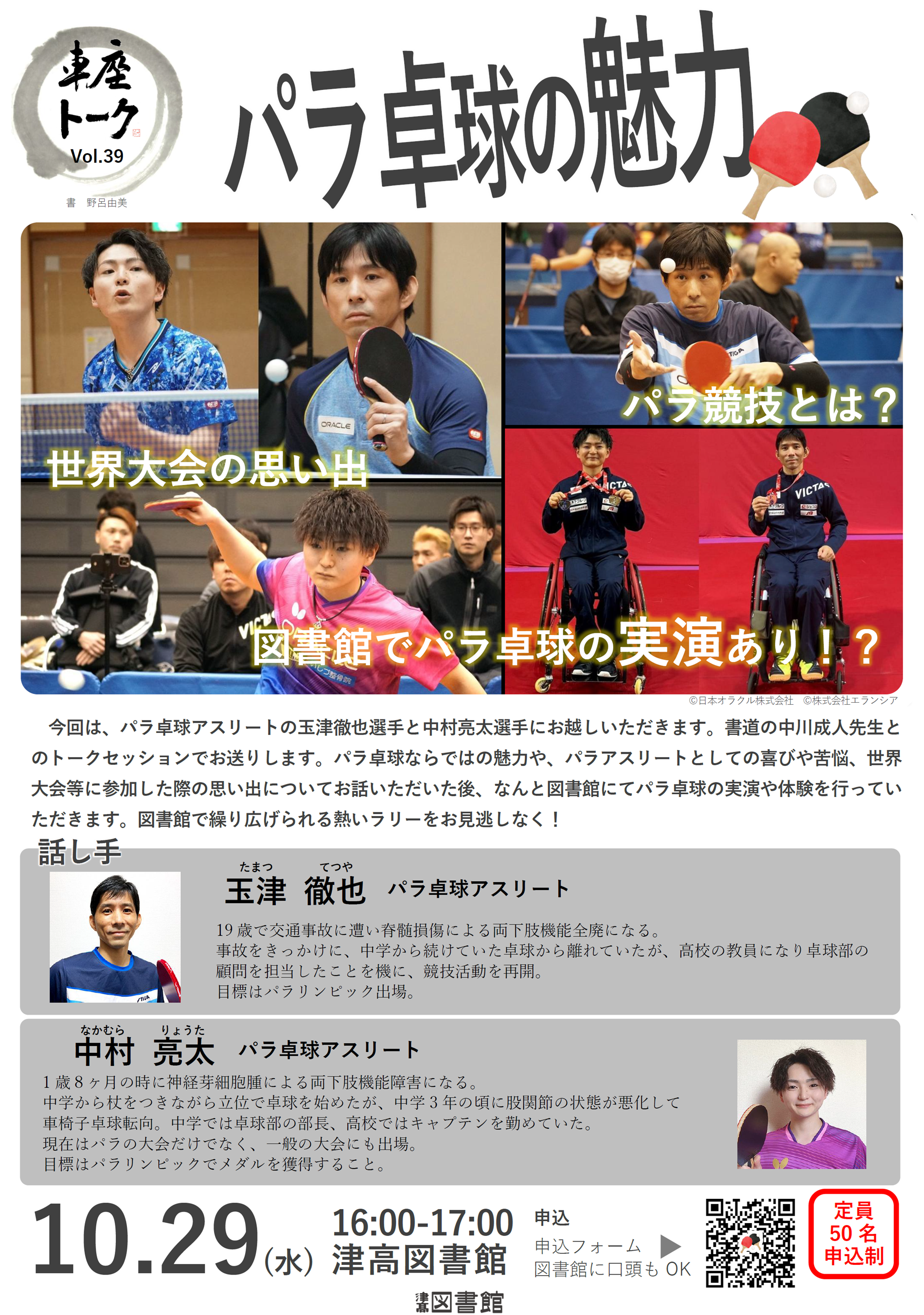 行事 行事車座トーク Vol.39「パラ卓球の魅力」のご案内 「車座」とは、人が輪になって内側を向き座ること。「車座トーク」は、生徒の皆さんに感覚の近い方を「話し手」に気軽に話をやりとりする場です。 今回は、パラ卓球アスリートの玉津徹也選手と中村亮太選手にお...