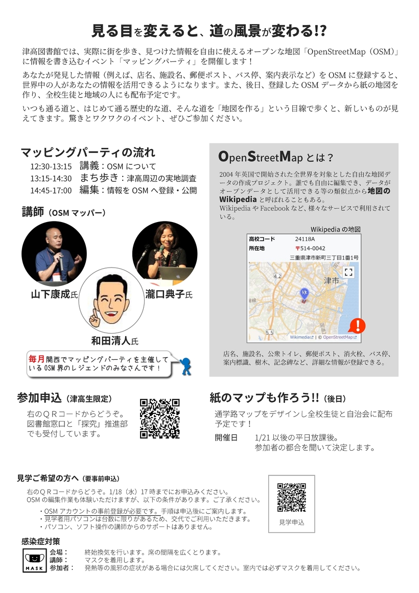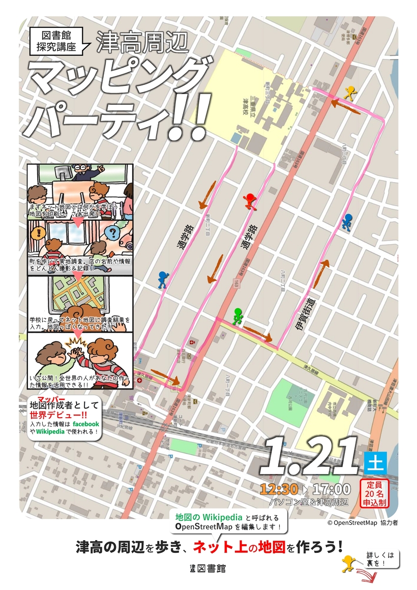 津高図書館では、実際に街を歩き、見つけた情報を自由に使えるオープンな地図「OpenStreetMap(OSM)」に情報を書き込むイベント「マッピングパーティ」を開催します!