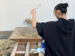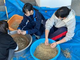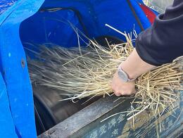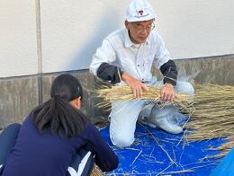 教わりながら、手際よく稲わらの束作り!