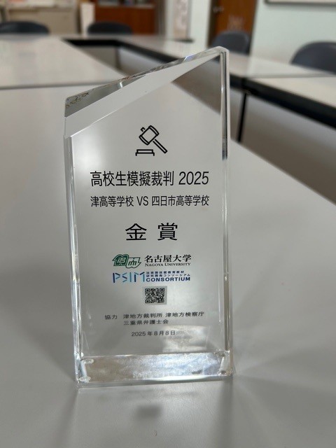 2025年10月01日(水) 行事 「高校生模擬裁判2025」金賞受賞!【2025.10.1】 8月8日(金)、名古屋大学 宮木教授の指導のもと、 四日市高校で開催の「高校生模擬裁判2025 四日市高等学校 VS 津高等学校」にて、 本校が見事金賞を受賞しました!