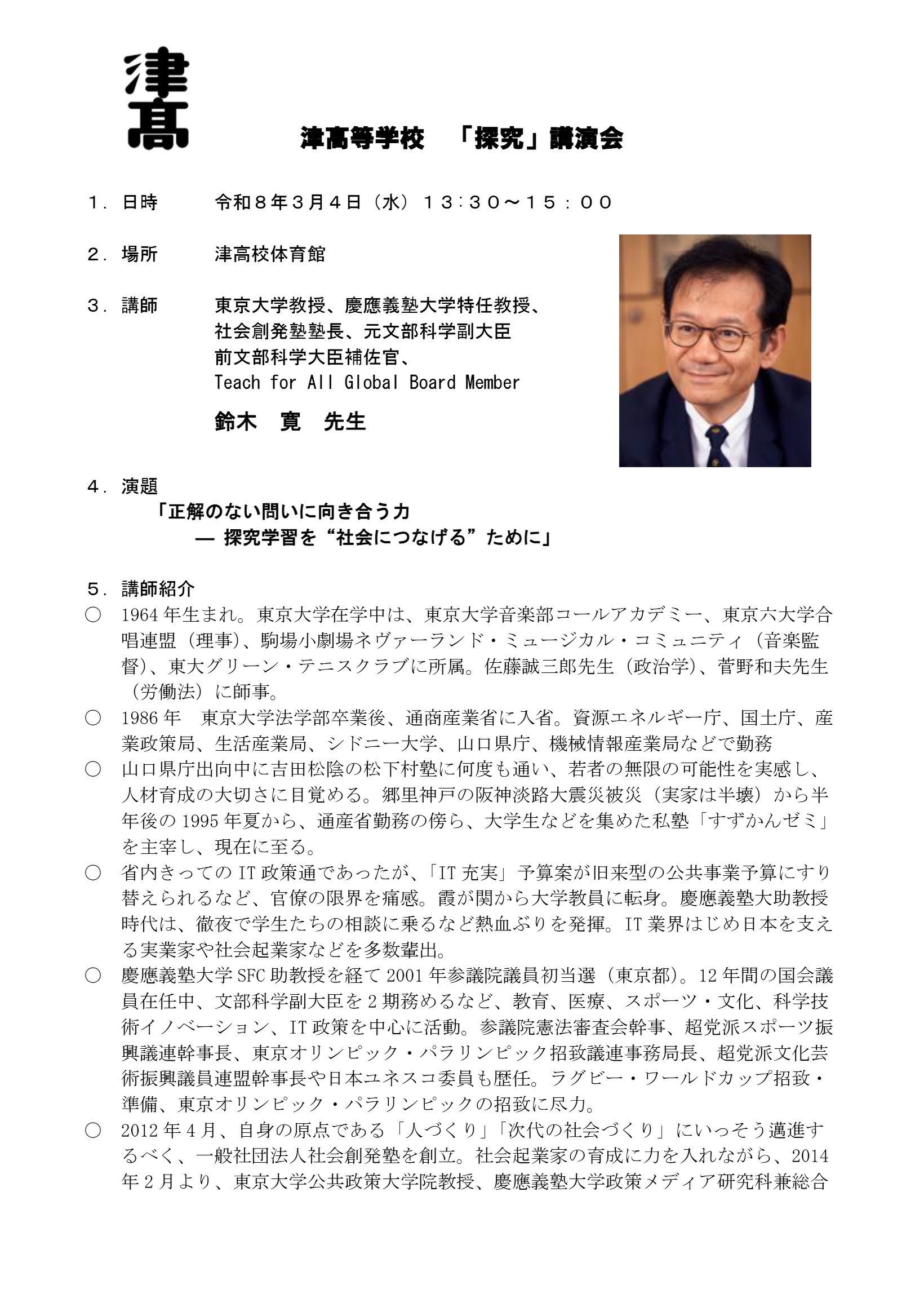 2026年02月28日(土) お知らせ NEW 津高等学校 「探究」講演会のお知らせ 本校では、3月4日(水)、鈴木 寛氏(東京大学教授、慶應義塾大学特任教授、元文部科学副大臣・前文部科学大臣補佐官)を講師にお迎えし、講演会を開催します。 演題は「正解のない問いに向き合う力 ― 探究学習を“社会につなげる”ために」。 これからの社会に求められる探究的な学びの意義や、学びを実社会へと結び付ける視点について、ご講演いただきます。