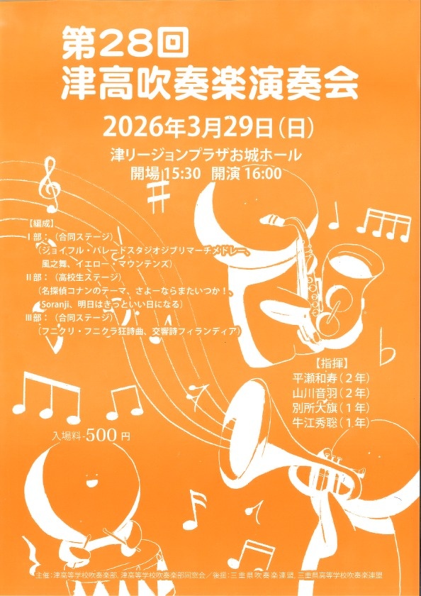 2026年03月10日(火) 部活 NEW 第28回 津高吹奏楽演奏会 のご案内【2026.3.10】 吹奏楽部による恒例の演奏会が、令和8年3月29日(日)に開催されます。 心に響くハーモニーを感謝の気持ちにのせて、皆様の元へお届けします♬ 日 時:令和8年3月29日(日) 開場 15:30 / 開演 16:00 会 場:津リージョンプラザ お城ホール 入場料:500円(全席自由) 問合せ:059-228-0256(顧問:山岡・中村)