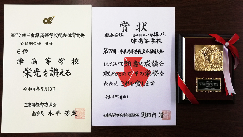 三重県高校総合体育大会男子の部で第6位表彰をうけました。