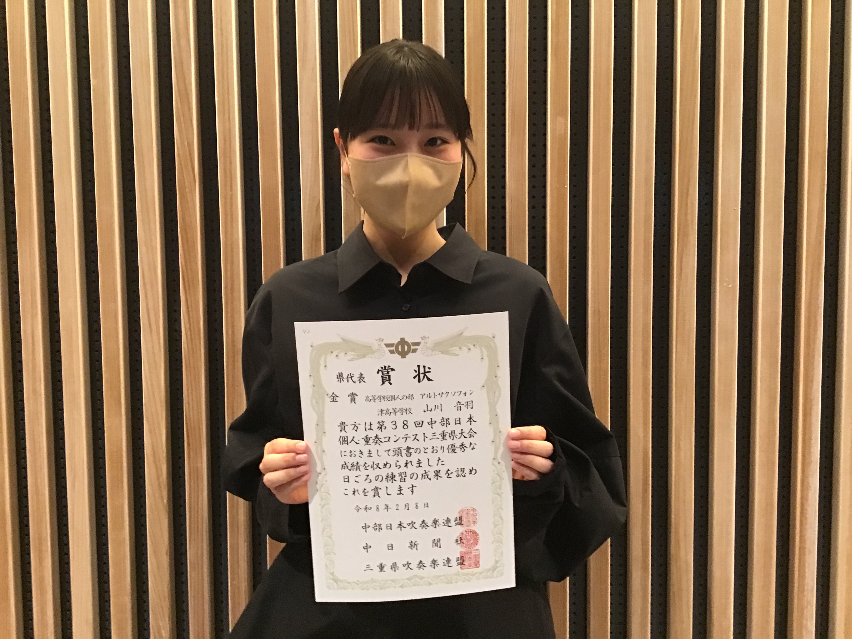 2026年02月09日(月) 部活 吹奏楽部「中部日本個人・重奏コンテスト」アルトサクソフォンで県代表!本大会出場へ!【2026.2.8】 2月8日開催「第38回中部日本個人・重奏コンテスト三重県大会」にて 吹奏楽部2年・山川音羽さんがアルトサクソフォン演奏で見事金賞を受賞! さらに県代表として、3月29日に滋賀県彦根市で開催されるの本大会出場が決定しました! 会場は、松阪市・クラギ文化ホール! 本番直前、極限まで音を磨き上げる! 念願の受賞!笑顔と賞状の記念写真!