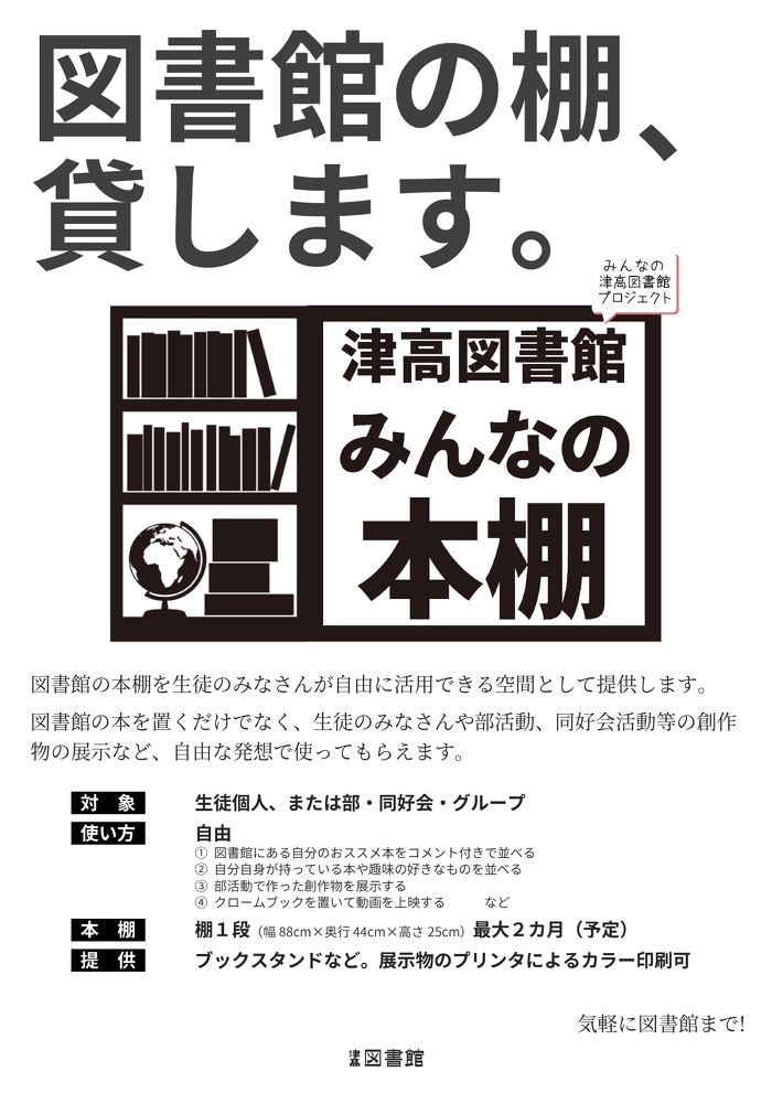 図書館の本を置くだけでなく、生徒のみなさんや部活動、同好会活動等の創作物の展示など、自由な発想で使ってもらえます。