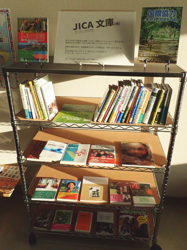 JICA文庫(仮)のご案内 2022年12月18日(日) 「世界とつながる三重県人」展と合わせ、独立行政法人国際協力機構(JICA)三重県デスクのご好意で借りることができた「海外協力隊の方々が書いた本」を展示しています。借りることもできます。