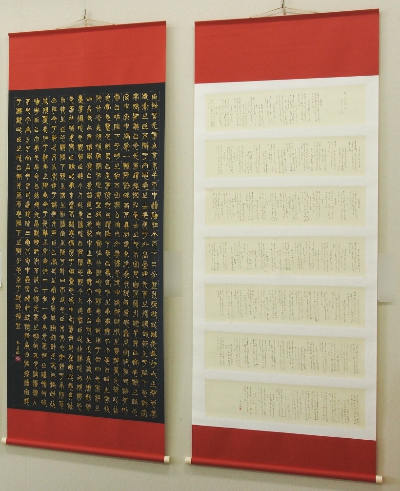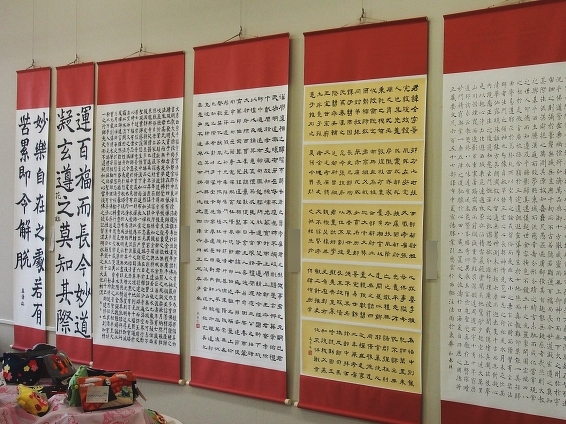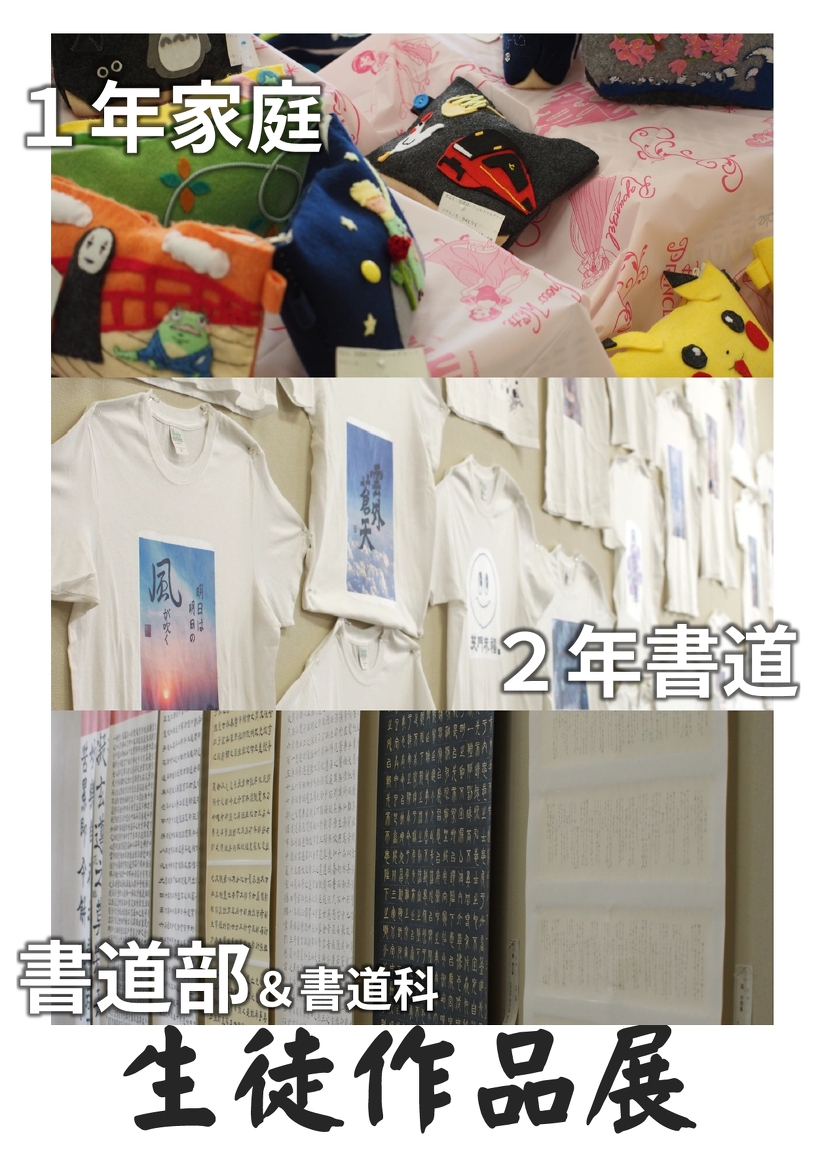 ギャラリー展示「1年家庭・2年書道・書道部&書道科 生徒作品展」 2023年02月03日(金) 1年生が家庭の授業で制作したポーチ、2年生が書道の授業で制作したTシャツ、さらに書道部と書道科の書の作品をギャラリーで展示しています。どれも力作ばかり。ぜひ見に来てください。