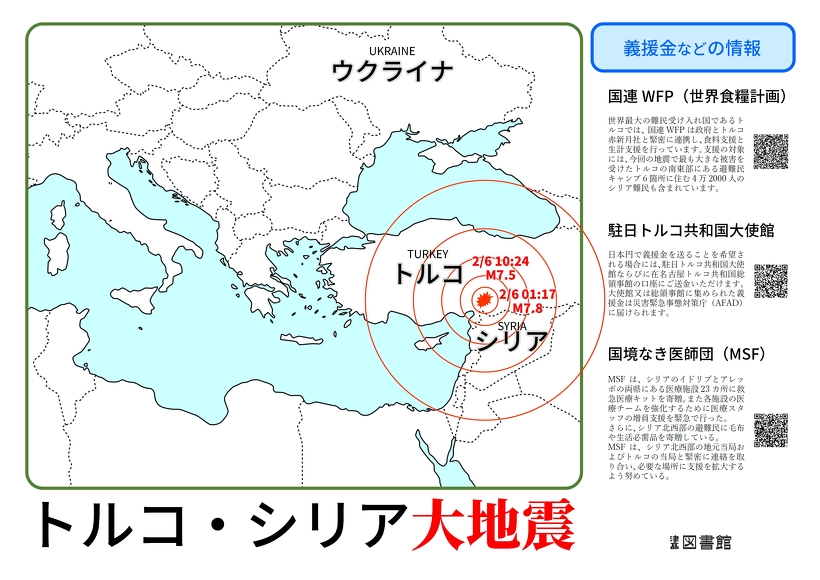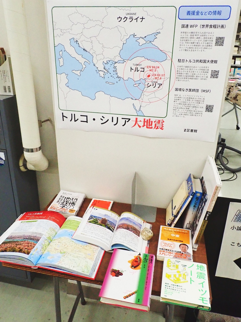 トルコ・シリア大地震のコーナーを作りました 2023年02月16日(木) 2月6日、トルコ南東部でマグニチュード7.8と推定される大地震が発生しました。この地震とその後の余震により、トルコ共和国とシリア・アラブ共和国は甚大な被害を受け、現在、世界各国による懸命な救出作業と被災者支援活動が行われています。 津高図書館では、2つの国に関する本や地震に関する本を展示しました。国連世界食糧計画や駐日トルコ共和国大使館の義援金等の情報も紹介しています。展示を通じ、ぜひ津高生に2つの国に関心を持ってもらいたいと思います。 ポスター画像(クリックで拡大します) トルコとシリア、地震に関する本を展示しています