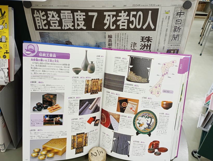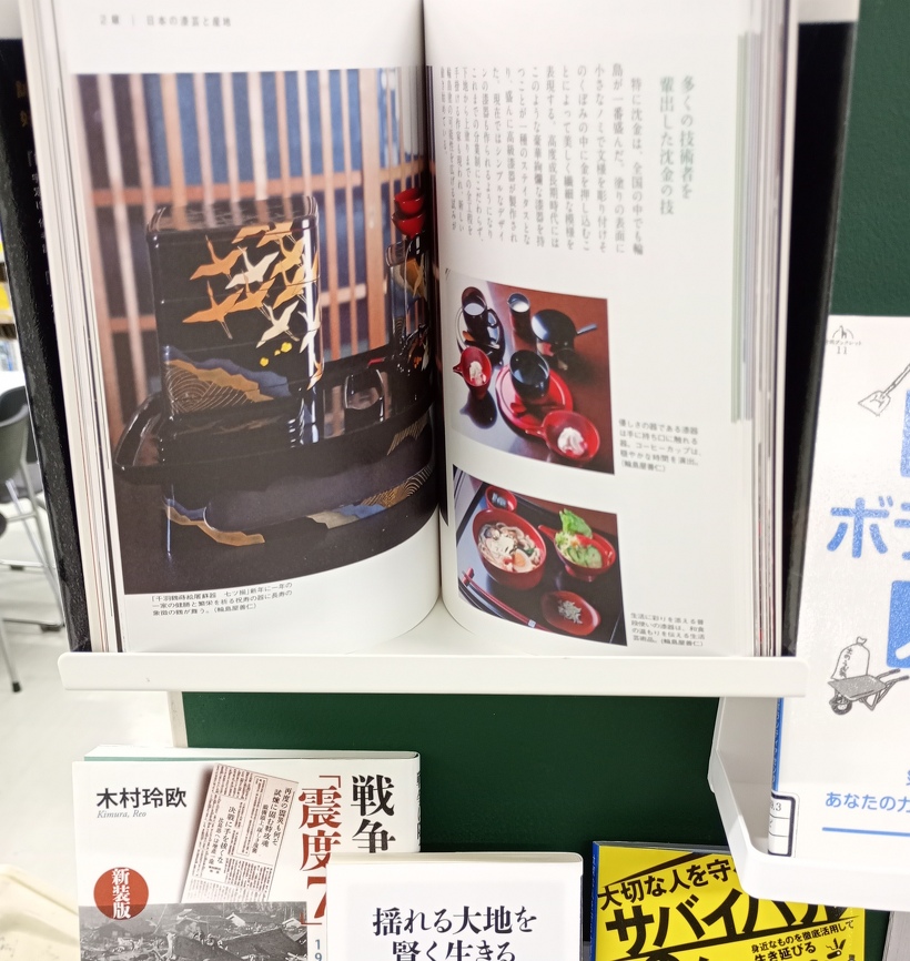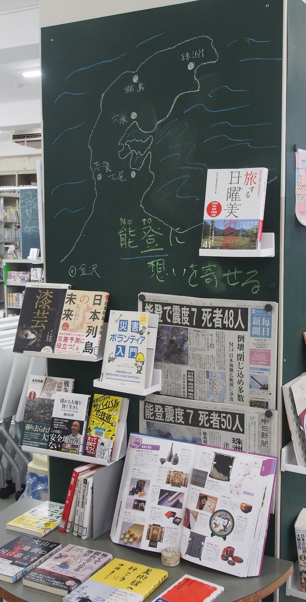 展示「能登に想いを寄せる」 2024年01月10日(水) 「能登に想いを寄せる」コーナーを開設しました。 一時期よりも報道が減っている中、継続的に関心を持ち続けて欲しいと思います。 コーナー全景 石川県の歴史や文化を紹介した本を展示 輪島塗をはじめとした漆芸の紹介