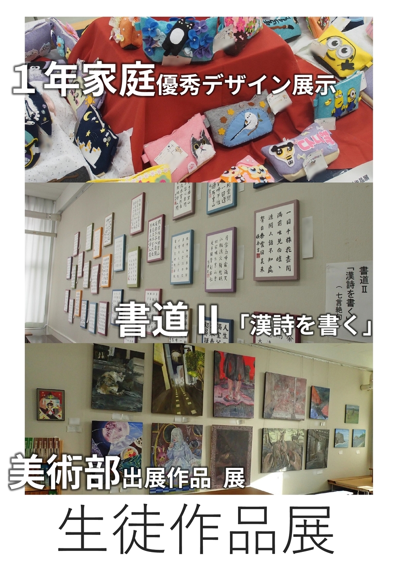 ギャラリー展示「1年家庭・2年書道・美術部 生徒作品展」 2024年02月01日(木) 1年生が家庭の授業で制作したフェルトマルチケース、2年生が書道の授業で制作した書、美術部の作品をギャラリーで展示しています。どれも力作ばかり。 家庭科のマルチケースでは、展示会場で好きな作品に投票することもできます。 ぜひ見に来てください!