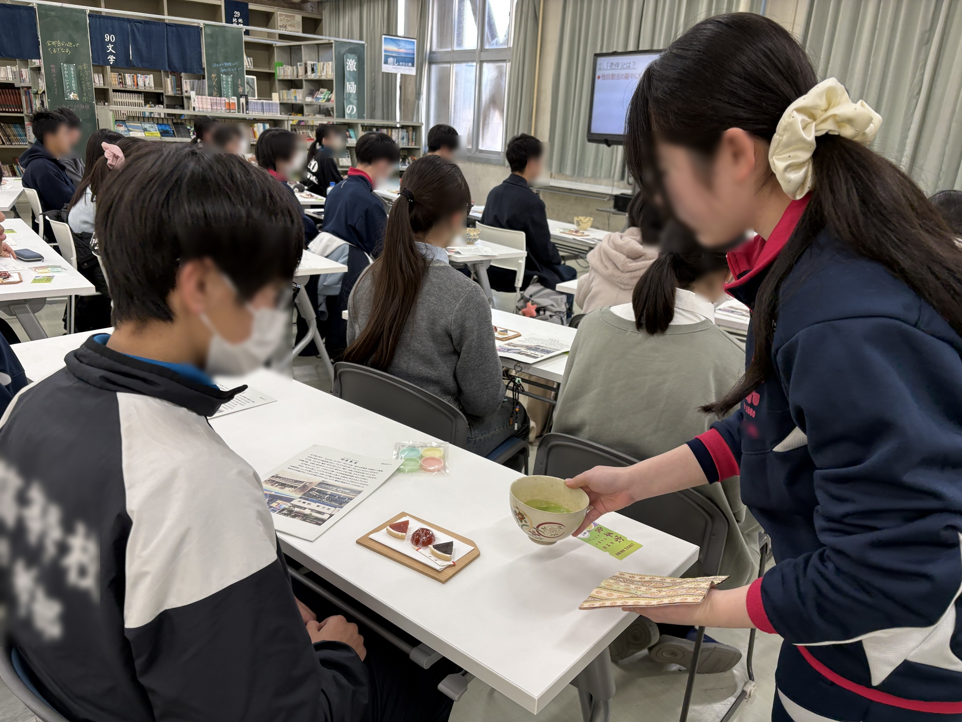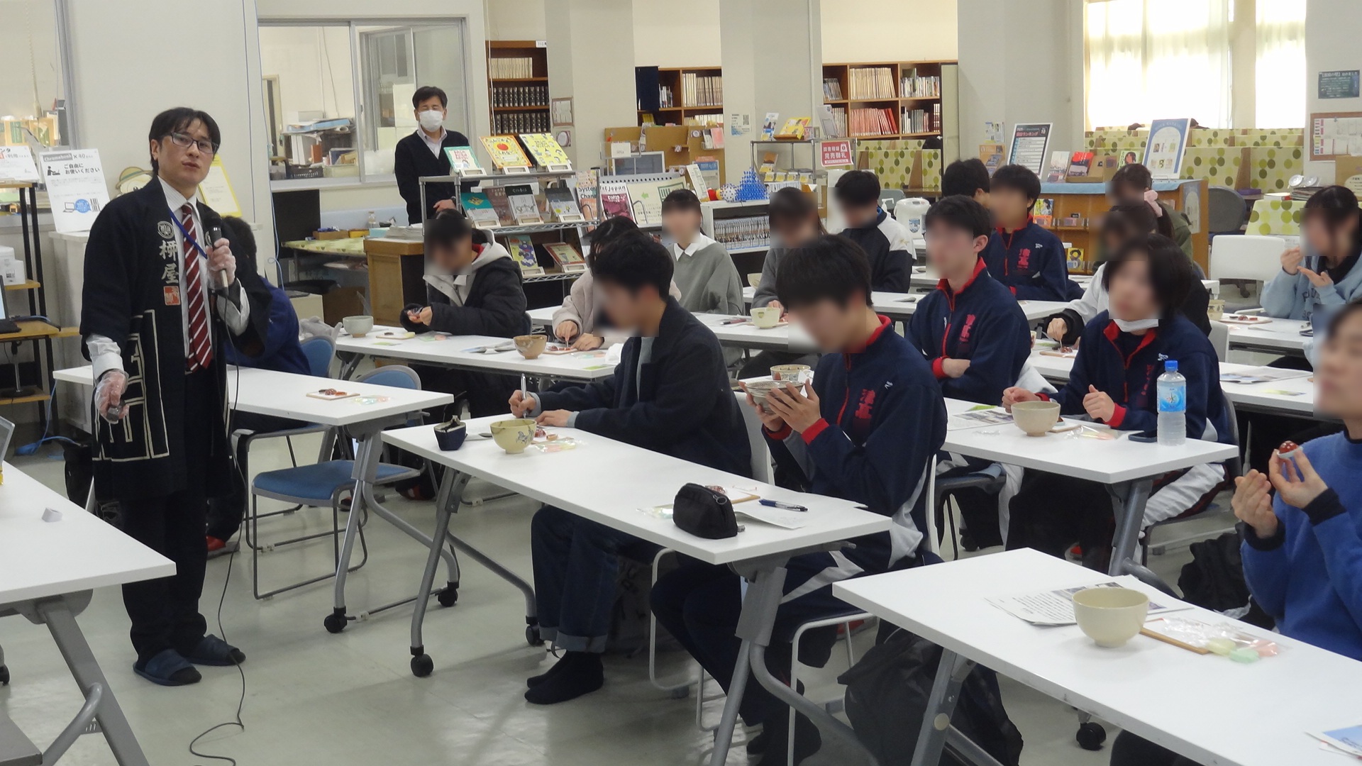 今回は柳屋奉善と本校の表千家茶道部・裏千家茶道部がコラボし、参加者は伝統銘菓「老伴」を三種類とお抹茶を味わいながらお話を聞くことができました。450年続く「老伴」の歴史的なお話や、柳屋奉善と「茶道」の深い関わり、バブル時代の柳屋奉善では動物をたくさん飼育していたことや、オンラインイベントなどのコロナ禍を乗り越えた奇抜なアイデアまで、多岐にわたるお話を聞かせていただきました。