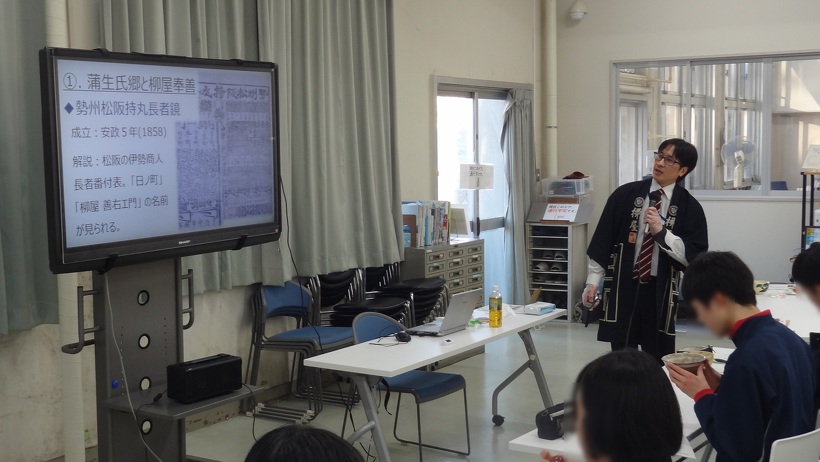 2月4日(水)放課後、車座トークVol.42「蒲生氏郷も愛した伝統銘菓「老伴」」を開催しました。40人の方にご参加いただきました。話し手は、株式会社 柳屋奉善 取締役営業部長の岡一世さんです。