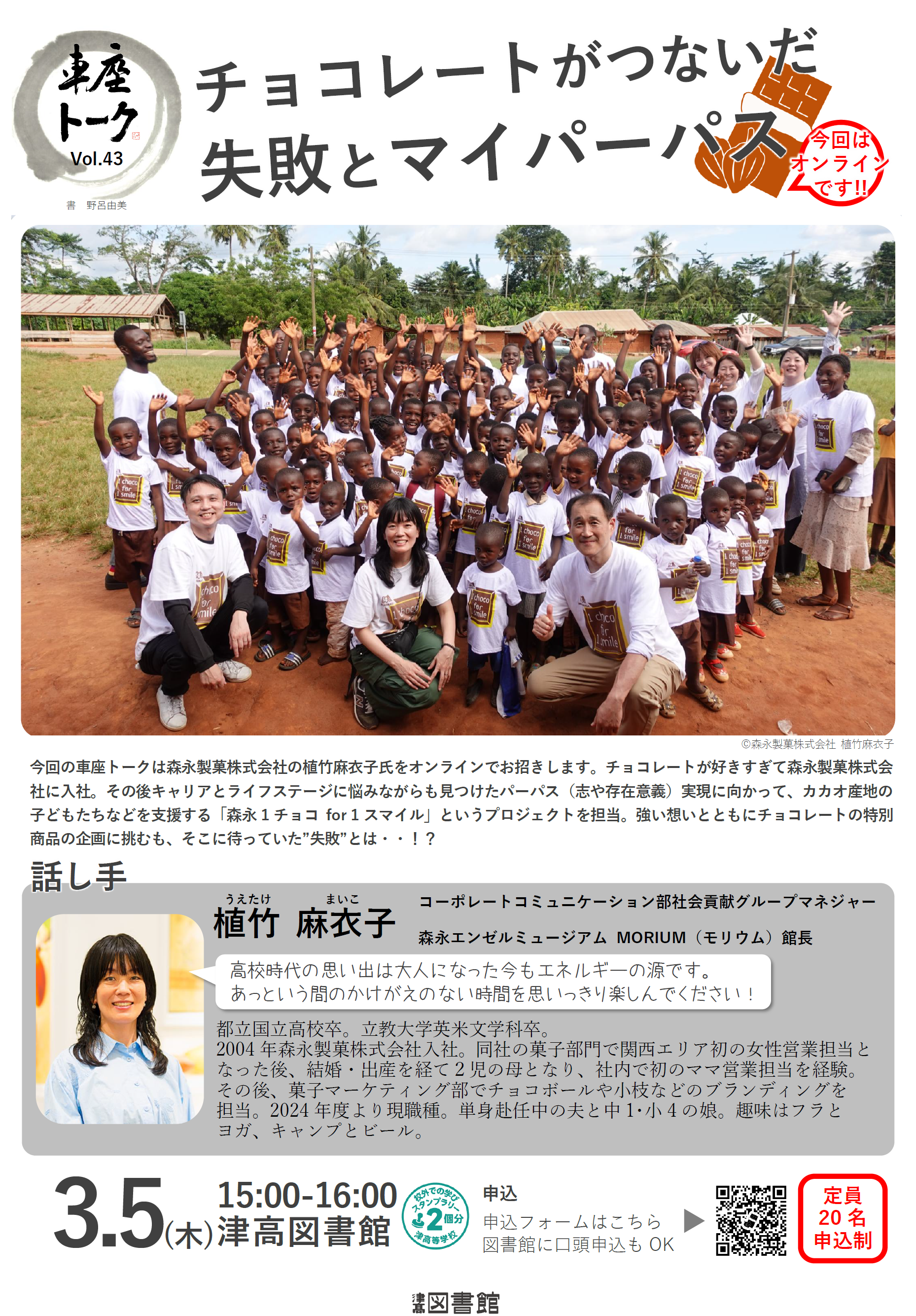 今回は、森永製菓株式会社より、植竹麻衣子さんをオンラインでお招きします。チョコレートが好きすぎて森永製菓株式会社に入社。その後キャリアとライフステージに悩みながらも見つけたパーパス(志や存在意義)実現に向かって、カカオ産地の子どもたちなどを支援する「森永1チョコ for 1スマイル」というプロジェクトを担当。強い想いとともにチョコレートの特別商品の企画に挑むも、そこに待っていた”失敗”とは・・!?