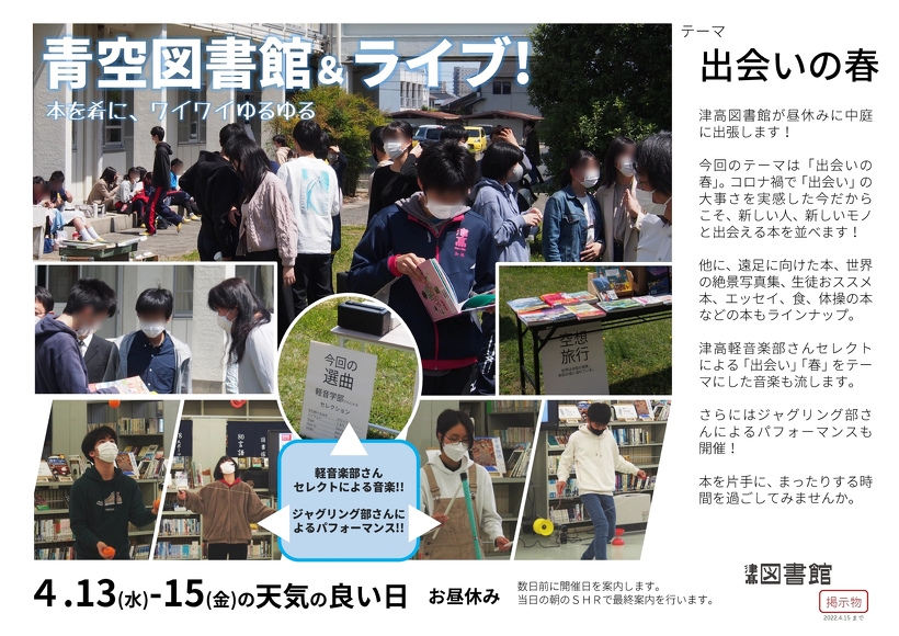 青空図書館&ライブのご案内 2022年04月05日(火) 津高図書館が昼休みに中庭に出張します! 今回のテーマは「出会いの春」。コロナ禍で「出会い」の大事さを実感した今だからこそ、新しい人、新しいモノと出会える本を並べます! 他に、遠足に向けた本、世界の絶景写真集、生徒おススメ本、エッセイ、食、体操の本などの本もラインナップ。 津高軽音楽部さんセレクトによる「出会い」「春」をテーマにした音楽も流します。 さらにはジャグリング部さんによるパフォーマンスも開催! 本を片手に、まったりする時間を過ごしてみませんか。 青空図書館&ライブ ポスター(クリックで拡大します)