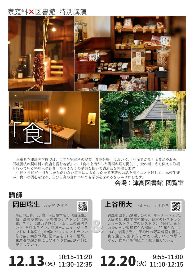 三重県立津高等学校では、1年生家庭科の授業「食物分野」において、「生産者がみえる食品やお酒、伝統製法の調味料の商店を営む若者」と、「食材を活かした野菜料理を提供し、食の楽しさを伝える取組も行っている料理人の若者」のおふたりの講師を招いて講演会を開催します。