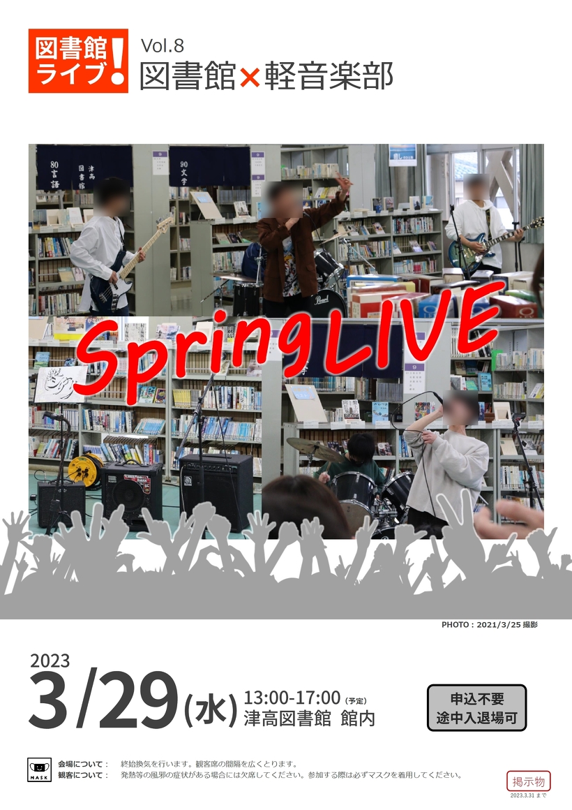 図書館ライブ!Vol.8 図書館×軽音楽部「Spring LIVE」のご案内 2023年03月03日(金) 軽音楽部さんによる春ライブを図書館で開催します! 卒業式を終えた3年生の皆さんも多数出演します。 途中入退場可能、ぜひお越しください! ■日時 令和5年3月29日(水曜日)13:00から17:00(予定) ■会場 津高図書館 ■申込 不要・途中入退場可 ポスター (クリックで拡大します)
