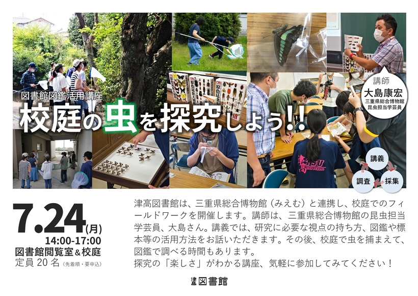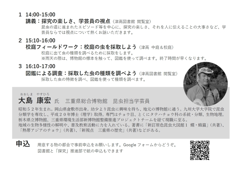講師は、三重県総合博物館の昆虫担当学芸員、大島さん。講義では、学芸員を志したきっかけ、研究に必要な心構えや視点の持ち方、図鑑や標本等の活用方法をお話いただきます。その後、校庭で虫を捕まえて、図鑑で調べる時間もあります。探究の「楽しさ」がわかる講座、気軽に参加してみてください!