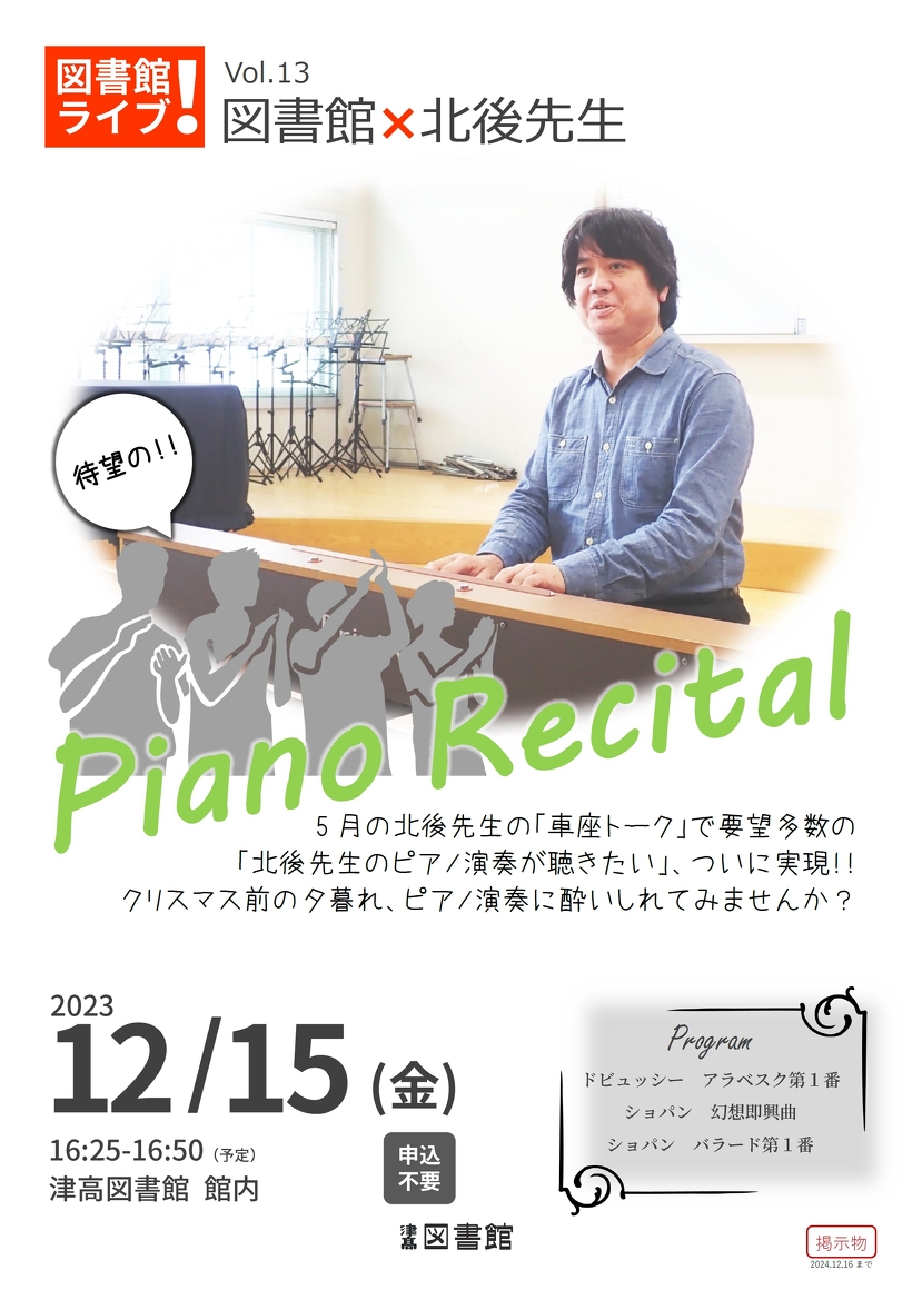 図書館ライブ!Vol.13 図書館×北後先生 Piano Recitalのご案内 2023年11月24日(金) 5月の北後先生の「車座トーク」で要望多数の「北後先生のピアノ演奏が聴きたい」、ついに実現!! クリスマス前の夕暮れ、ピアノ演奏に酔いしれてみませんか? ■日時 令和5年12月15日(金曜日)16:25から16:50 ■会場 津高図書館 ■対象 津高生 ■申込 不要・当日参加可 ■Program ドビュッシー アラベスク第1番 ショパン 幻想即興曲 ショパン バラード第1番 ポスター (クリックで拡大します)