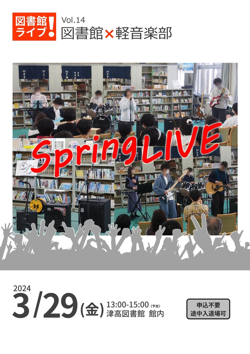 図書館ライブ!Vol.14 図書館×軽音楽部「Spring LIVE」のご案内 2024年02月16日(金) 軽音楽部さんによる春ライブを図書館で開催します! 卒業式を終えた3年生の皆さんも多数出演します。 途中入退場可能、ぜひお越しください! ■日時 令和6年3月29日(金曜日)13:00から15:00(予定) ■会場 津高図書館 ■申込 不要・途中入退場可 ポスター (クリックで拡大します)