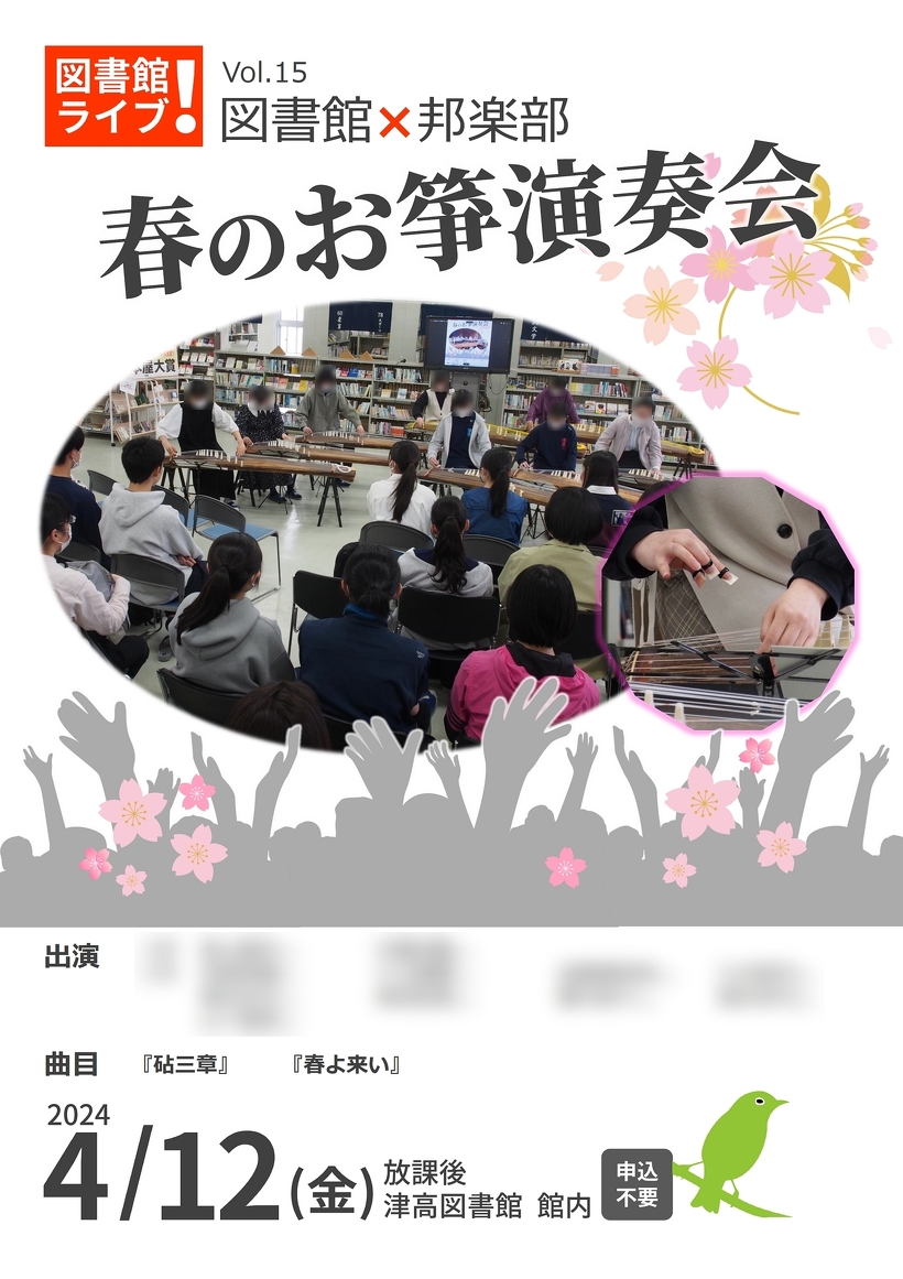 図書館ライブ!Vol.15図書館×邦楽部「春のお箏演奏会」のご案内 2024年04月02日(火) 邦楽部のみなさんによる箏の演奏会を開催します。 ■日時 令和6年4月12日(金)放課後 ■会場 津高図書館 ■申込 不要 ■曲目 『砧三章』『春よ来い』 ポスター (クリックで拡大します)