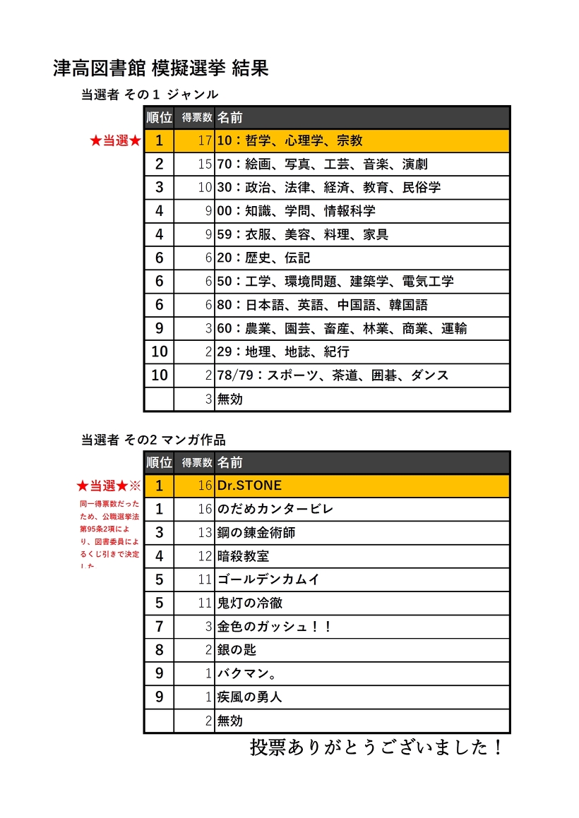 「その2 マンガ作品」に関しては、まさかの同一得票数となり、本物の選挙のルールに沿って図書委員さんによるくじ引きで当選作品が決定しました!