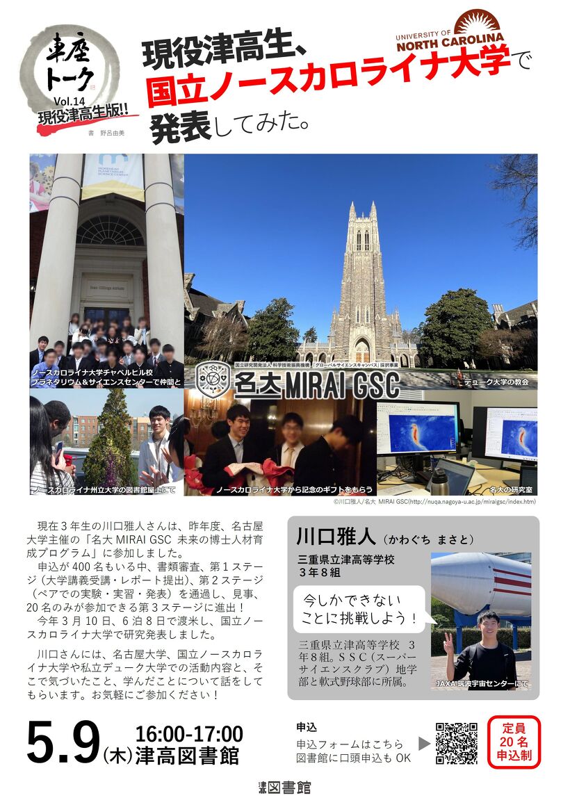 車座トーク Vol.14「現役津高生、国立ノースカロライナ大学で発表してみた。」のご案内