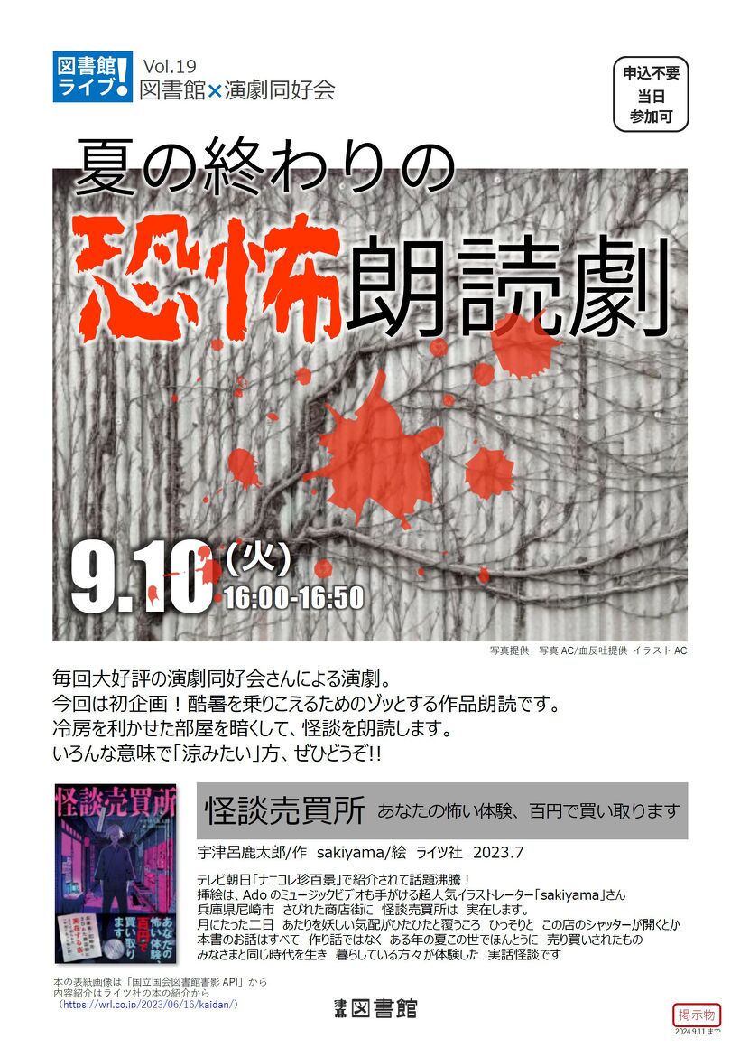 図書館ライブ!Vol.19 図書館×演劇同好会「夏の終わりの恐怖朗読劇」のご案内 2024年09月02日(月) 毎回大好評の演劇同好会さんによる演劇。 今回は初企画!酷暑を乗りこえるためのゾッとする作品朗読です。 冷房を利かせた部屋を暗くして、怪談を朗読します。 いろんな意味で「涼みたい」方、ぜひどうぞ!! ■作品 『怪談売買所 あなたの怖い体験、百円で買い取ります』より (宇津呂鹿太郎/作 sakiyama/絵 ライツ社 2023.7) ■日時 令和6年9月10日(火曜日)16:00から16:50 ■会場 津高図書館 ■対象 津高生 ■申込 不要・当日参加可 ポスター (クリックで拡大します)