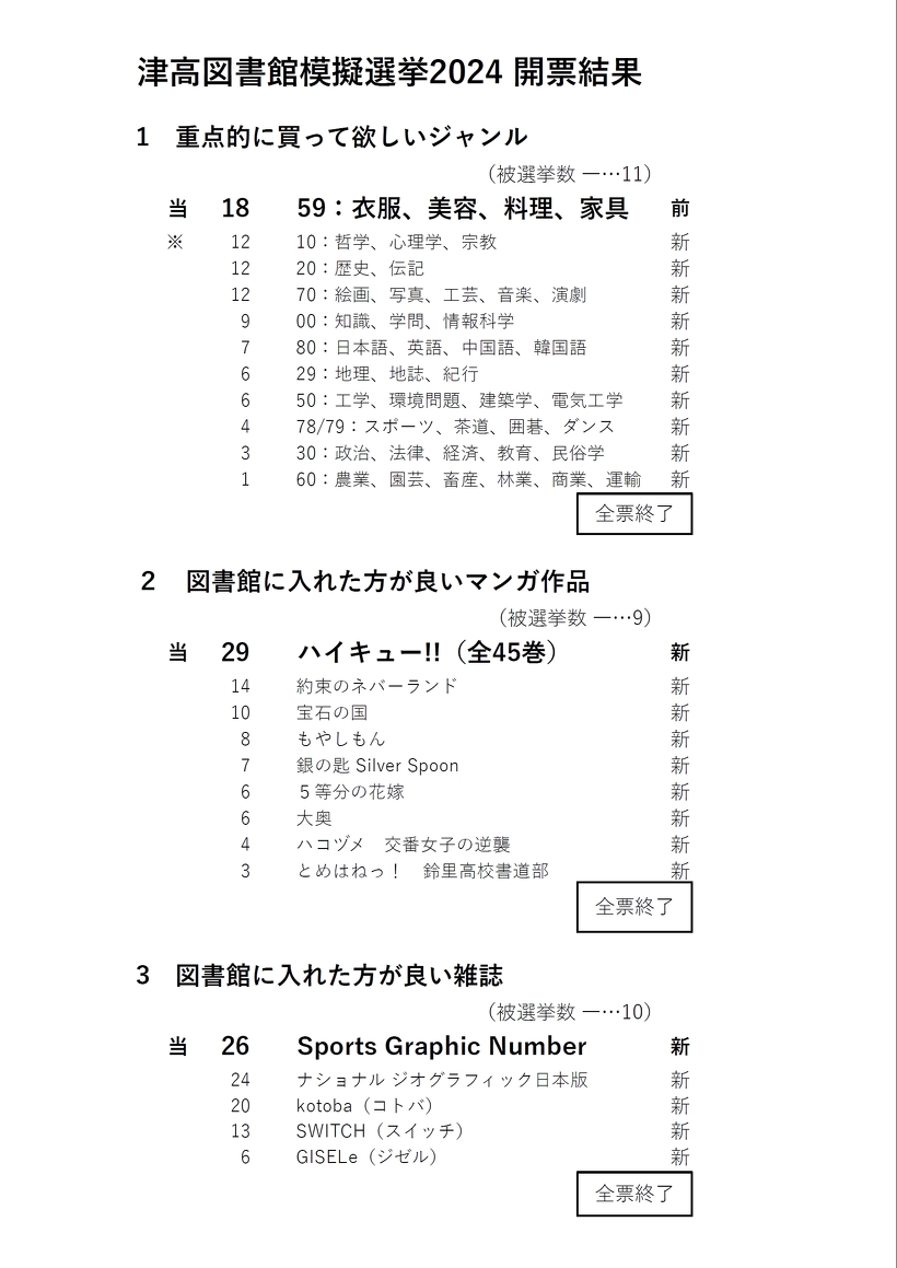 令和6年9月2日から20日にかけて開催した津高図書館 模擬選挙2024の開票作業が終わりました。