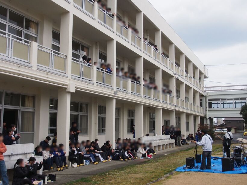 3月6日(木曜日)の昼休み、「中庭ライブ!!」を開催しました。いつも「青空図書館」のときのBGM選曲でお世話になっている軽音楽部さんによる、初の野外ライブです。