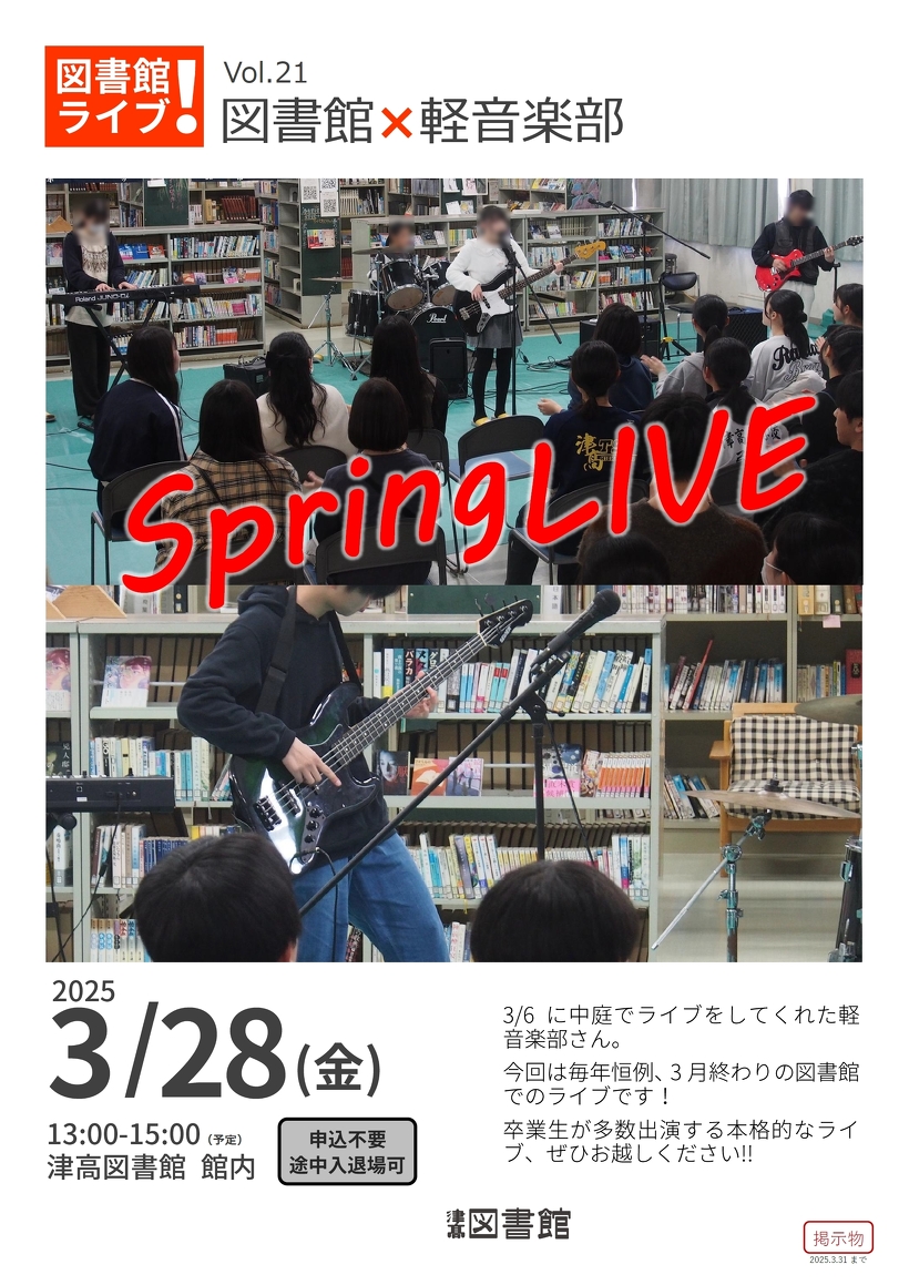 図書館ライブ!Vol.21 図書館×軽音楽部「SpringLIVE」のご案内 2025年03月12日(水) 3/6に中庭でライブをしてくれた軽音楽部さん。 今回は毎年恒例、3月終わりの図書館でのライブです! 卒業生が多数出演する本格的なライブ、ぜひお越しください!! ■日時 令和7年3月28日(金曜日)13:00から15:00 ■会場 津高図書館 ■申込 不要・途中入退場可 ポスター (クリックで拡大します)