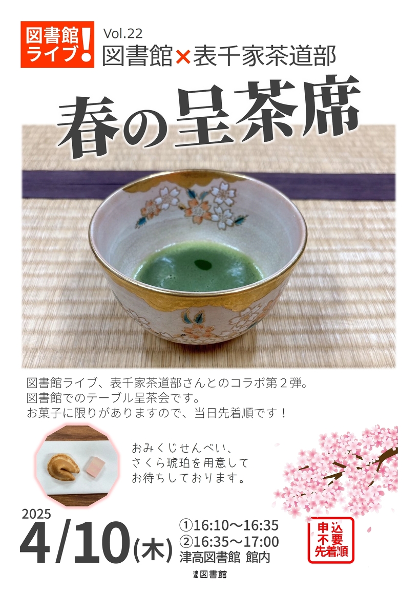 図書館ライブ!Vol.22 図書館×表千家茶道部「春の呈茶席」のご案内 2025年03月26日(水) 図書館ライブ、表千家茶道部さんとのコラボ第2弾。 図書館でのテーブル呈茶席です。 お菓子に限りがありますので、当日先着順です! おみくじせんべい、さくら琥珀を用意してお待ちしております。 ■日時 令和7年4月10日(木曜日)①16:10から16:35 ②16:35から17:00 ■会場 津高図書館 館内 ■申込 不要・先着順 ポスター (クリックで拡大します)