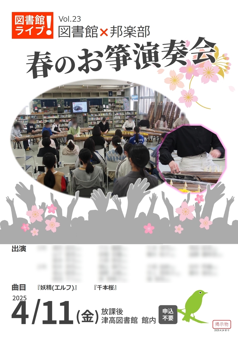 図書館ライブ!Vol.23図書館×邦楽部「春のお箏演奏会」のご案内 2025年03月27日(木) 邦楽部のみなさんによる箏の演奏会を開催します。 ■日時 令和7年4月11日(金)放課後 ■会場 津高図書館 ■申込 不要 ■曲目 『妖精(エルフ)』『千本桜』 ポスター (クリックで拡大します)