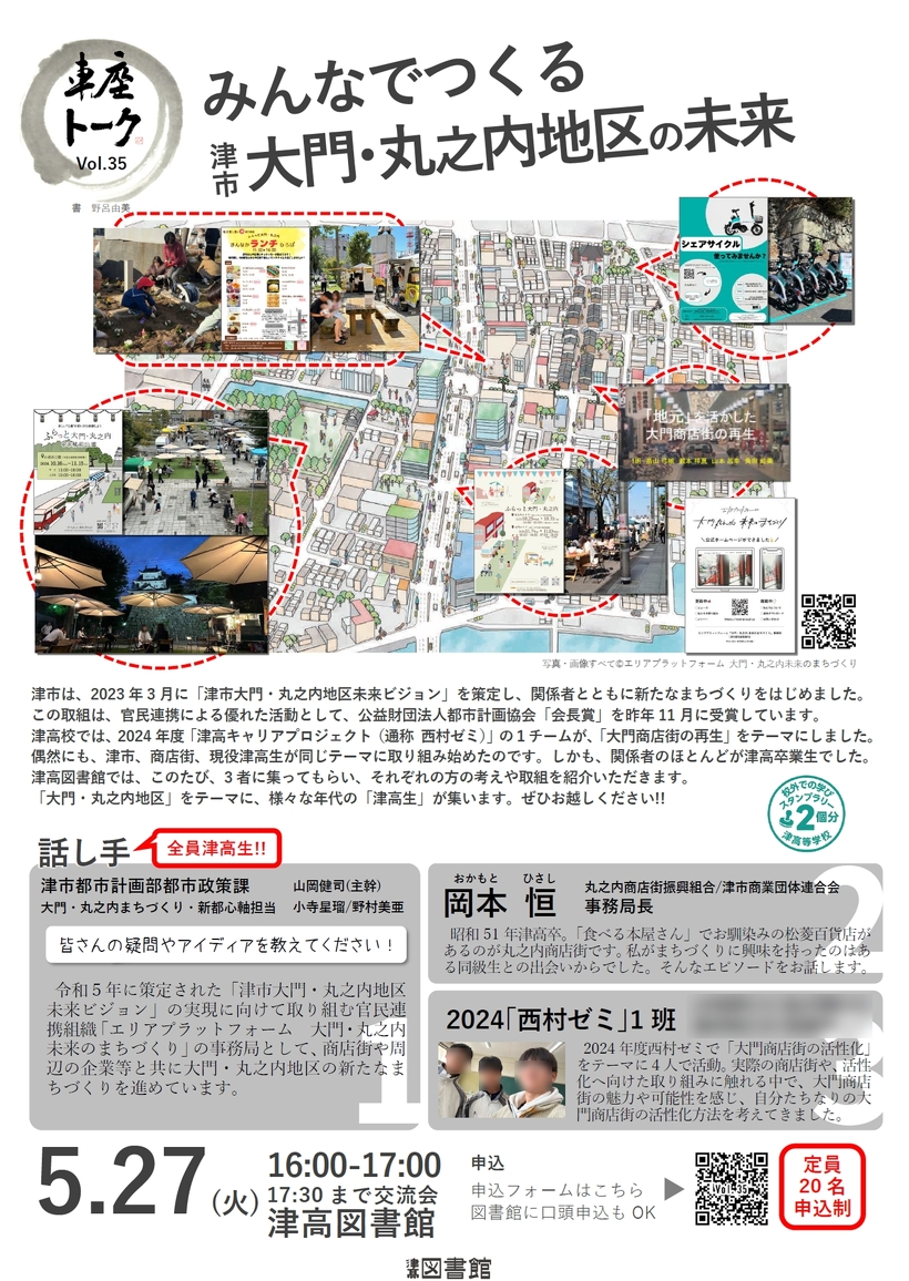 5月27日(火)放課後、車座トークVol.35「みんなでつくる津市大門・丸之内地区の未来」を開催しました。17人の方にご参加いただきました。話し手は、津市都市計画部都市政策課 大門・丸之内まちづくり・新都心軸担当の山岡健司さん、小寺星瑠さん、野村美亜さん、酒井亮さん。丸之内商店街振興組合・津市商業団体連合会の岡本恒さん。2024年度西村ゼミ1班の山本昌幸さん、畠山弓槻さん、瀧本祥真さん、角田絵美さんです。