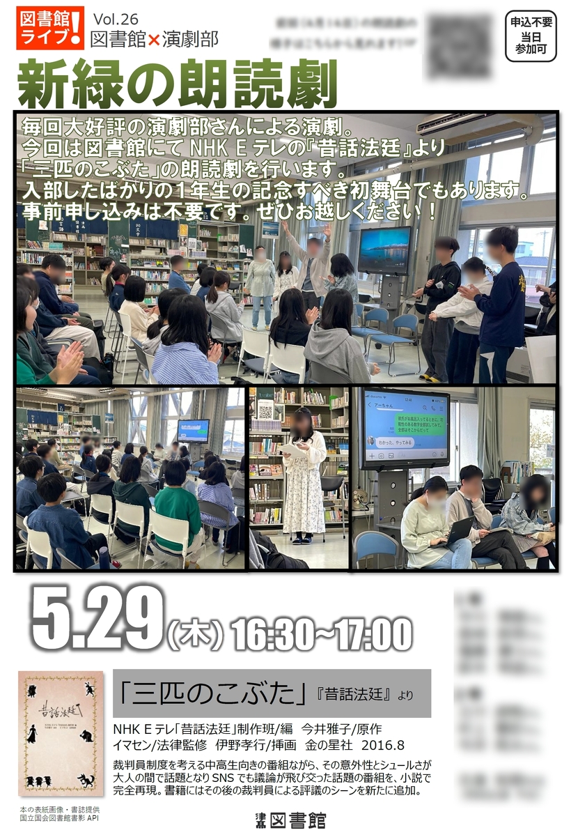 図書館ライブ!Vol.26 図書館×演劇部「新緑の朗読劇」が開催されました。 2025年05月29日(木) 5月29日(木)の放課後に図書館にて演劇部さんが、NHK Eテレの『昔話法廷』より「三匹のこぶた」の朗読劇を行いました。 入部したばかりの1年生の記念すべき初舞台! 最後は観客が裁判官となり、投票で判決をくだしました。 演劇部のみなさん、観覧していただいたみなさん、ありがとうございました。 ■作品 「三匹のこぶた」 『昔話法廷』 NHK Eテレ「昔話法廷」制作班/編 今井雅子/原作 イマセン/法律監修 伊野孝行/挿画 金の星社 2016.8 より ポスター (クリックで拡大します)