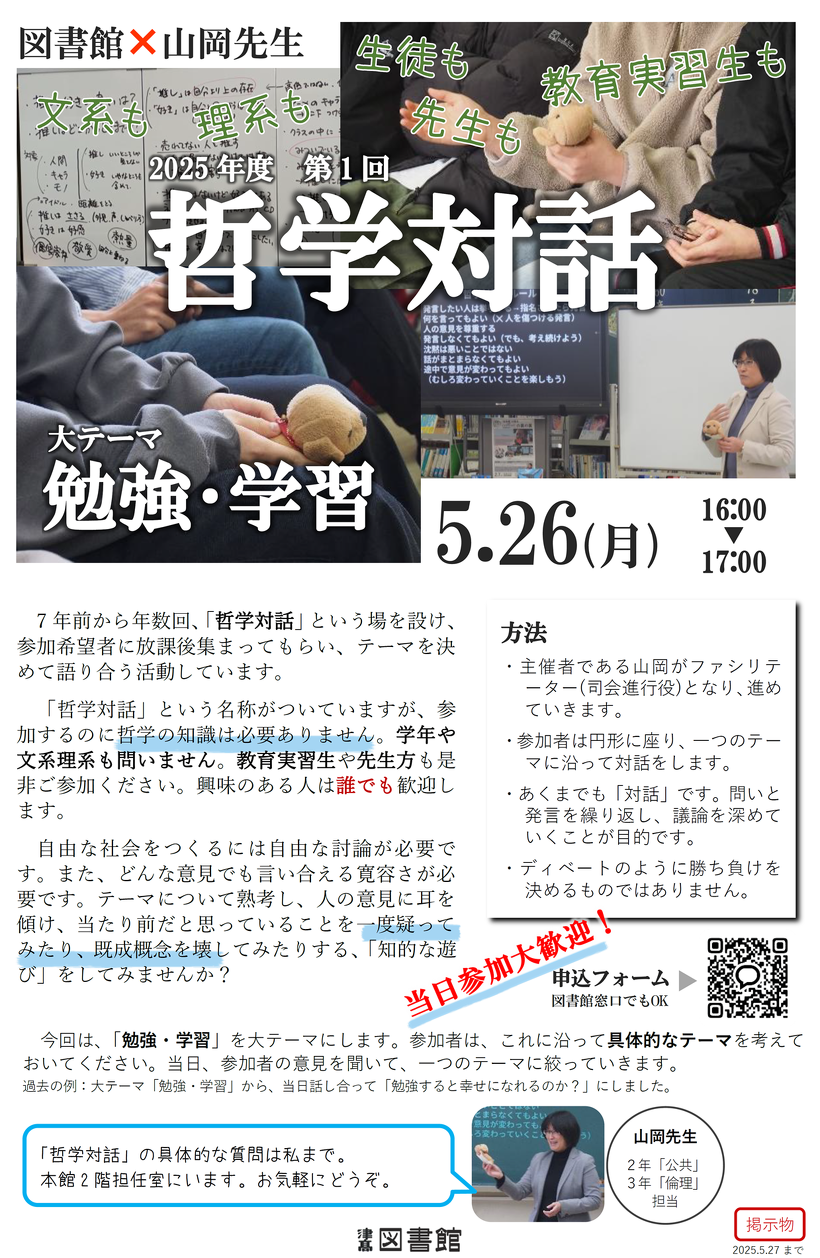 図書館×山岡先生 哲学対話(2025 第1回)を開催しました 2025年05月26日(月) 5月26日(月)放課後、山岡先生による「哲学対話」を開催しました。教育実習生4人を含む21名の方が参加しました。 今回の大テーマは「学習・勉強」。具体的に何を話し合いたいかを対話する中で、①勉強と学習の違い何か?②どちらがより能動的でどちらが受動的か?と考えることになりました。 企画・進行役の山岡先生、教育実習生の皆さん、参加してくれた皆さん、ありがとうございました!