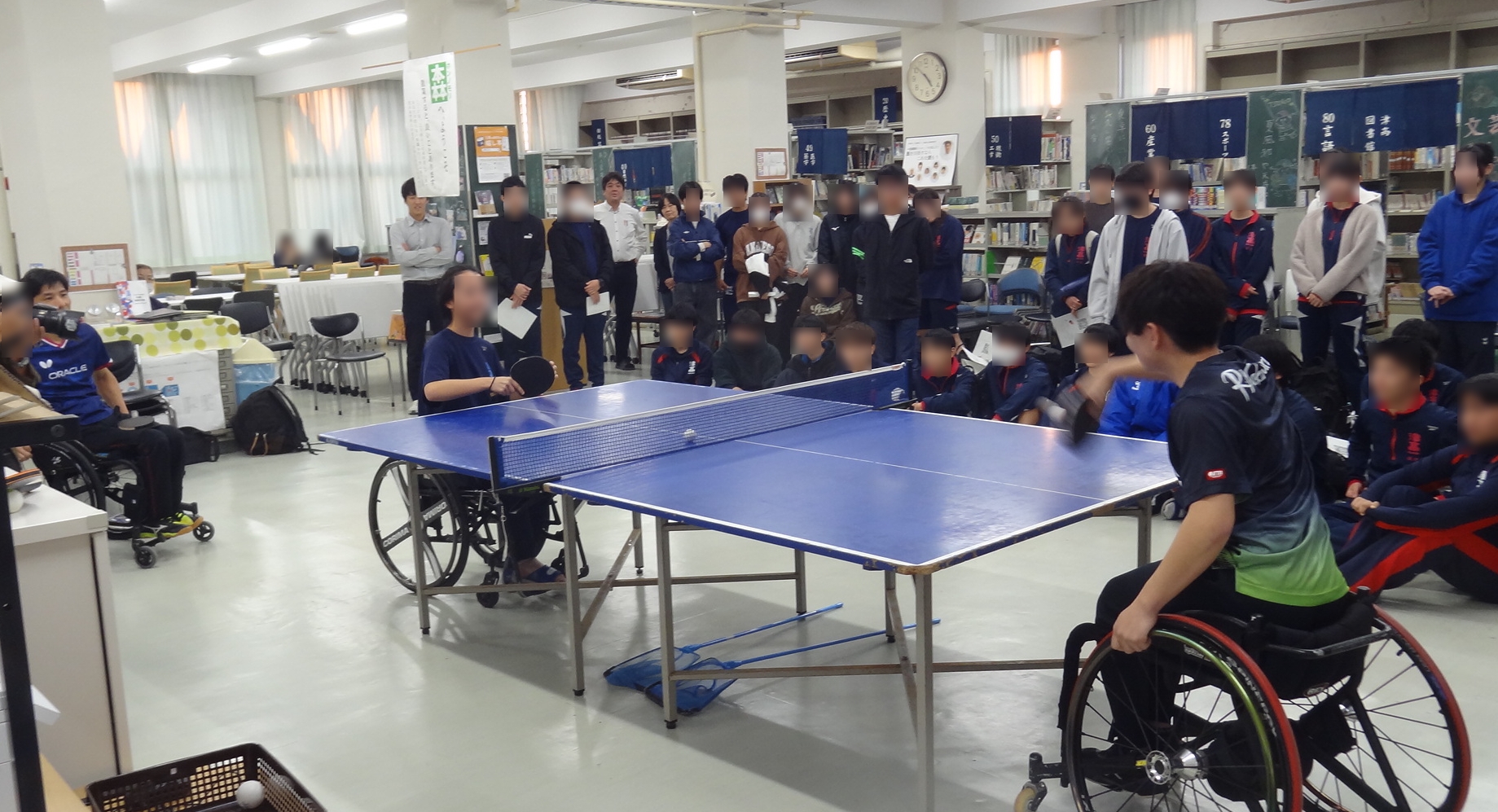 お話の後はなんと、図書館でパラ卓球の実演をしてもらいました。卓球部の皆さんに協力していただき、実際に競技用の車いすに乗せていただき、ラリーをする体験をしてもらいました。車いすでパラ卓球の体験をした生徒からは、「普段よりもサーブが難しい」や「軸がぶれて大変だった」という感想を語っていました。