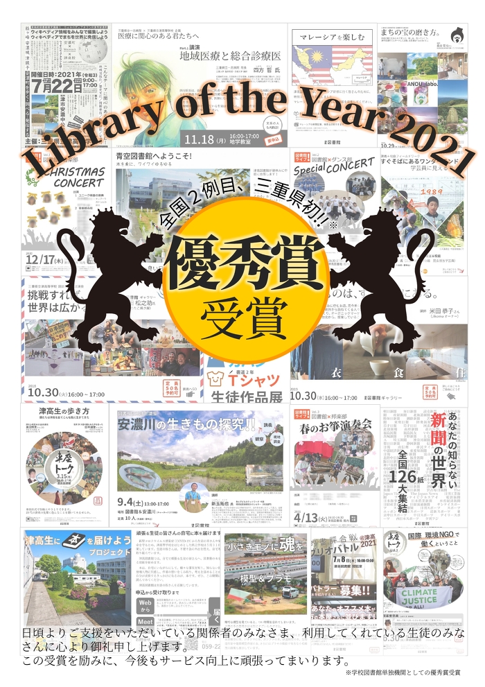 このたび、三重県立津高等学校図書館がNPO法人知的資源イニシアティブ(IRI)が授与する「Library of the Year(ライブラリー・オブ・ザ・イヤー)」の「2021 優秀賞」を受賞することが決定しました。
