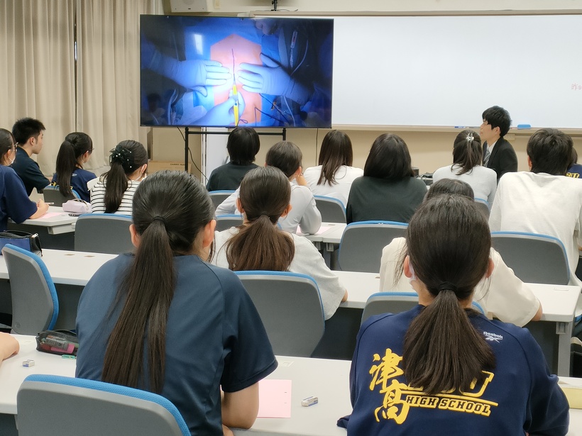 さらに、辻先生ご自身が津高生時代には文系選択者で、大学卒業後に銀行員としてお勤めされた後、医師になるべく転身された異例の経歴をおもちです。職業などの選択にあたっては、感動やあこがれのようなポジティブな思考と、恥をかきたくないなどのネガティブなものがあるが、高校生の間は、あくまでも前向きに進めばよいなどと、進路選択にあたって考えなければならない大事な基本姿勢を改めて教えていただいた実り多い研修となりました。