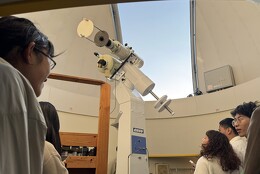 本校の校舎屋上にある「天文ドーム」へ大学生を案内し、大型望遠鏡を用いて太陽の黒点観測を行いました。