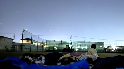 当日は寒風吹きすさぶ厳しい冷え込みの中、第一グラウンドにブルーシートと断熱マットを敷き、万全の防寒対策を整えました。生徒たちは防寒着を着込み、毛布と寝袋を使って横になりながら観測に臨みました。