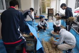 10/22(水)、コメプロジェクトに参加する生徒や有志生徒が、お米の脱穀に取り組みました。