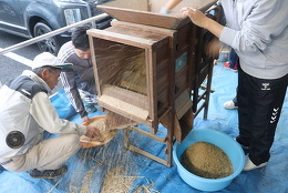 お借りした足踏み式脱穀機と唐箕を使って、伝統的な手法で脱穀と米の選別を行いました。